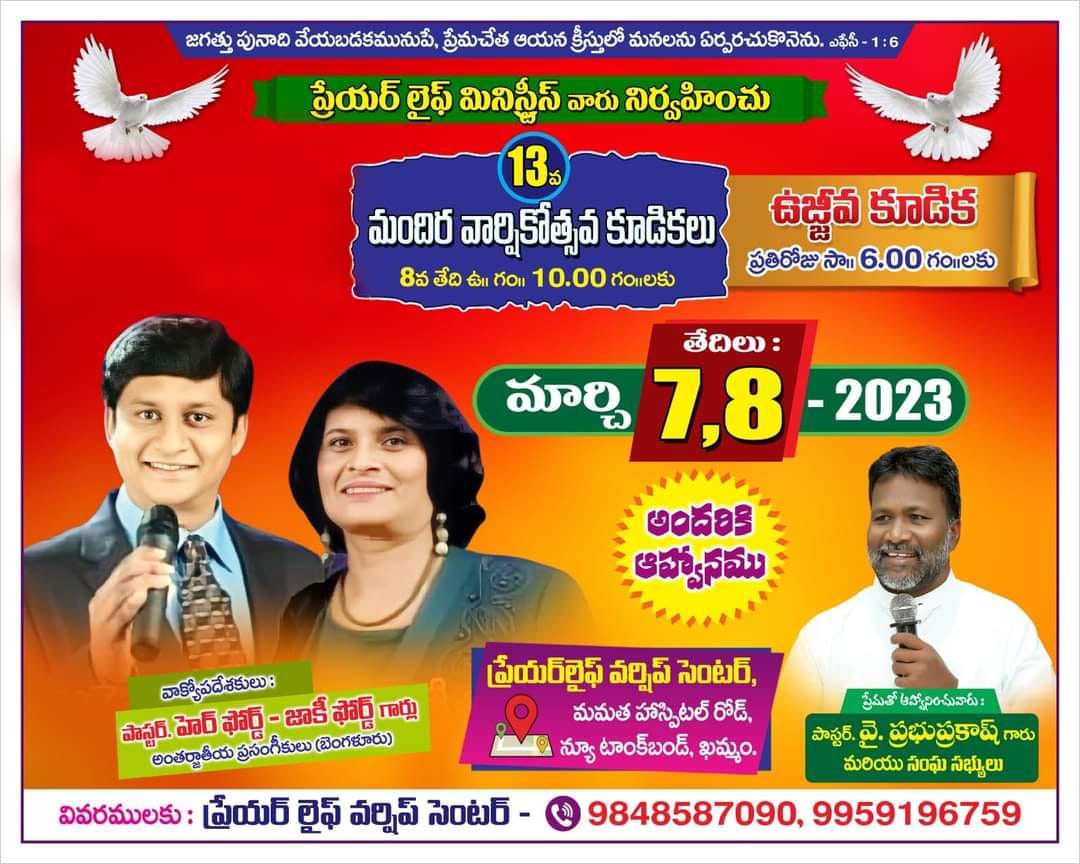 13th Anniversary MeetingsBy admin / March 8, 2023 When 08/03/2023 6:00 pm Add To Calendar Download ICS Google Calendar iCalendar Office 365 Outlook Live Where Prayer Life Worship Center Mamata Hospital Road, Khammam, Telangana Event Type Gospel Meetings